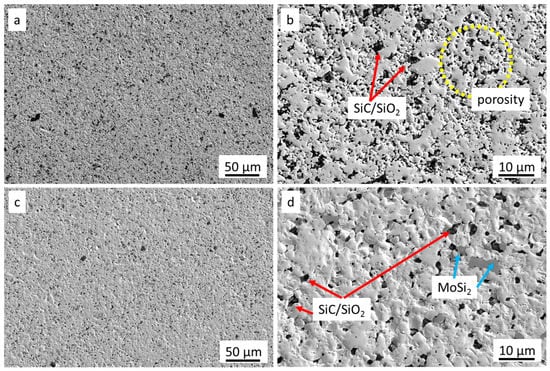 The ceramic composites were prepared starting from commercial powders: hexagonal TaB2 (Materion, Milwaukee, WI, USA, purity 99.5%), mean grain size 0.91 µm; tetragonal MoSi2 (<2 µm, Sigma-Aldrich, Steinheim, Germany), particle size range 0.3–5 µm, and oxygen content 1 wt%; C (Degussa EB 158). A mixture with 87% of TaB2, 10 vol% of MoSi2, and 3 vol% of carbon black was prepared. MoSi2 was added to promote matrix densification, and carbon was included in the mixture to reduce residual silica in the final microstructure and promote the formation of silicon carbide during sintering.