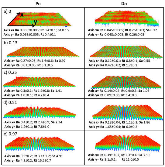 Optical profilometer 3D images of the grooves and ridges obtained using Accumulated Fluence ϕ (kJ/cm2) (a) 0, (b) 0.13, (c) 0.25, (d) 0.51, and (e) 0.97. Ra, Rt, and Sa values are expressed in µm. X direction is along the grooves; Y direction is perpendicular to the grooves.
