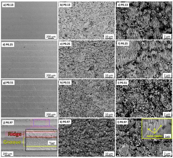At high magnifications, the microstructure of both materials showed the formation of nanostructures with spacing ranging between 220 and 380 nm (Figure 3c,f,i,l, and Figure 4c,f,i,l), the so-called LIPSS, Laser-Induced Periodic Surface Structures, e.g., a regular system of parallel straight lines. These are usually formed after irradiation with ultrashort, linearly polarized laser pulses. The most accepted explanation for the origin of these structures is based on the interference of the incident laser radiation with electromagnetic surface waves that propagate or scatter at the surface of the irradiated material [].