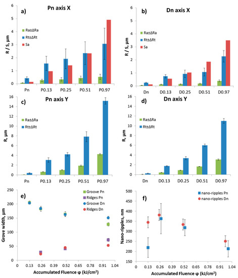Trend of features of the femtosecond-treated surfaces: (a–d) Ra, Rt, and Sa values of Pn and Dn samples in X (along the grooves) and Y axes (perpendicular to the grooves). (e) Evolution width of groves and ridges and (f) evolution size of nano-ripple structures (notice that Pn values are shifted by 0.02 kJ/cm2 to avoid overlapping of points in the graph and improve readability).