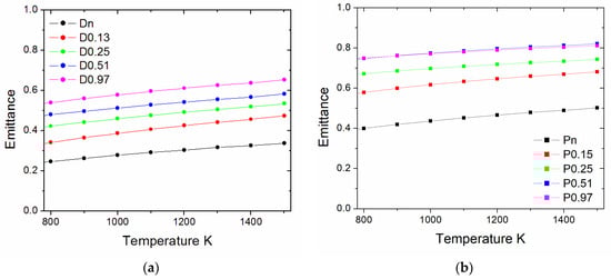 where B(λ,T) is the blackbody spectral radiance at the temperature T, λ1 = 0.3 µm and λ2 = 16.0 µm. It is worth noting that the use of room-temperature spectra to estimate the values of optical parameters α and ε(T) is widely reported in the literature as the accepted approach to comparing different samples []. The calculated values are, in general, underestimated with respect to the direct measurement at high temperatures [].