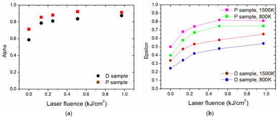 (a) Solar absorptance α and (b) thermal emittance ε as a function of the accumulated laser fluence.