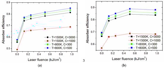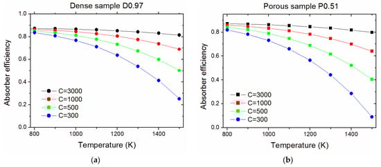 Figure 11 compares the calculated efficiency of treated surfaces for four chosen cases: a temperature of 1500 K and solar concentration ratios of C = 3000 (compatible with solar dish systems) or C = 1000 (compatible with both dish and solar tower) and an 800 K temperature with C = 500 or C = 300 (compatible with solar towers) []. In all the cases considered, the treatments considerably increased the photothermal efficiency of the absorber with respect to the pristine surfaces. Among the considered cases, the highest efficiency is obtained with T = 800 K and C = 500 (0.85 and 0.89 for the dense and porous samples, respectively). The efficiency values obtained with T = 1500 K and C = 3000 are remarkable (0.81 and 0.84). It is worth noting that this range of parameters (high temperature and high concentration) represents a key point for novel applications that are recently emerging, like CST for the so-called solar chemistry, e.g., for the production of sustainable fuels and chemicals requiring energy-intensive processes []. From Figure 11, it appears that the best-performing surfaces are D0.97 for the dense sample and P0.51 for the porous one. For these surfaces, we calculated the efficiency as a function of temperature (Figure 12).
