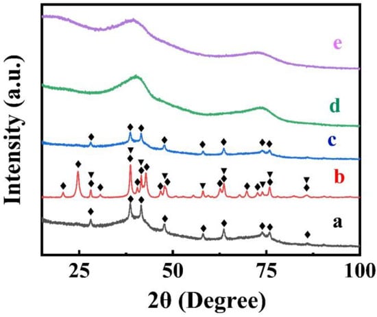 X-ray diffraction patterns of (a) FAM, (b) FAM-BM, (c) FAM-THB, (d) FAM-GC and (e) FAM-PEI (♦—peaks corresponding to JCPDS file 01-073-9835 of α -FeOOH, ▼—peaks, corresponding to JCPDS file 01-089-0596 of α -Fe2O3).