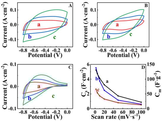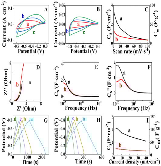 In total, 0.5 M of Na2SO4 was used as an electrolyte. The electrodes were tested by cyclic voltammetry (CV) and electrochemical impedance spectroscopy (EIS) using a PARSTAT 2273 potentiostat (Ametek, Berwyn, PA, USA) and galvanostatic charge-discharge (GCD) using a BioLogic VMP 300 potentiostat (Biologic, Willow Hill, IL, USA). The potential range for FeOOH was −0.8 to 0 V. EIS was tested in the frequency range of 10 mHz to 100 kHz at a voltage amplitude of 5 mV. A 3-electrode electrochemical cell was used, which contains a working electrode, a reference electrode (SCE, saturated calomel electrode) and a counter-electrode (Pt mesh). The areal capacitance CS (F cm−2) and gravimetric capacitance Cm (F g−1) were calculated from CV, EIS and GCD data, as described in a previous investigation [].