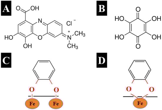Chemical structures of (A) GC and (B) THB, and catecholate bonding mechanisms to Fe atoms on the particle surface: (C) bidentate bridging bonding and (D) bidentate chelating bonding.