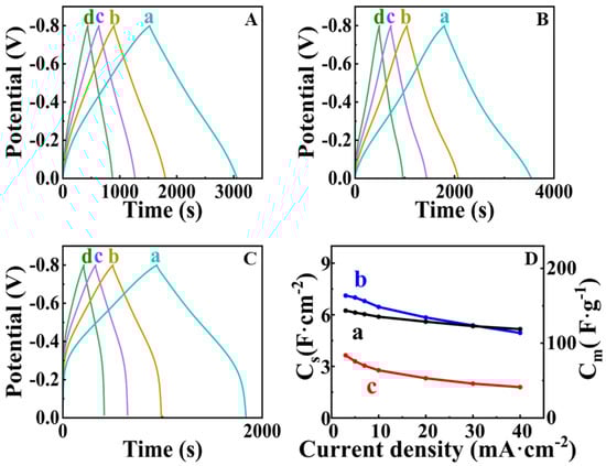 (A–C) GCD data at current densities of (a) 3, (b) 5 and (c) 7 and (d) 10 mA cm−2 for (A) FAM-THB, (B) FAM-GC and (C) FAM-PEI; (D) capacitance versus current density for (a) AM-THB, (b) FAM-GC and (c) FAM-PEI. SCE was used as a reference electrode.
