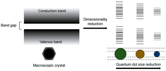 QCE is a phenomenon where the energy levels of a material become discrete when the particle is close to or smaller than the Bohr radius of the exciton (Figure 1). This phenomenon allows for the manipulation of the physical properties of semiconductor nanocrystals (NCs) by controlling their size. QDs are a type of NC, and their size can be precisely controlled, enabling tuning of their emission light from ultraviolet to infrared, which is a practical application of QCE [11].