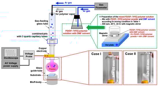 Figure 1 depicts the experimental setup of the AP plasma deposition system employed in this study using a mixed polymer solution comprising P[VDF–TrFE] polymer nano powder and DMF solvent for P[VDF–TrFE] thin film deposition. In our previous publication, we described in detail the experimental setup of the AP plasma deposition system [,,,]. This AP plasma deposition technique is a method capable of synthesizing nanoparticles (NPs) or depositing films at room temperature [,,,]. The AP plasma deposition system comprises a gas feeding tube, a glass guide tube for producing plasma discharge, a bluff body, and combined jets with three quartz capillary tubes. The quartz capillary jets were assembled in a triangular shape and attached with copper tape as a high-voltage electrode. The bluff body was made of polytetrafluoroethylene material, and the substrate was placed on the bluff body inside the glass guide tube.
