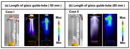Figure 2a,b present photographs and ICCD images of the plasma discharge produced through vaporization of the mixed P[VDF–TrFE] polymer nano powder with DMF solvent in the AP plasma deposition system for two different guide tube lengths (cases I and II).