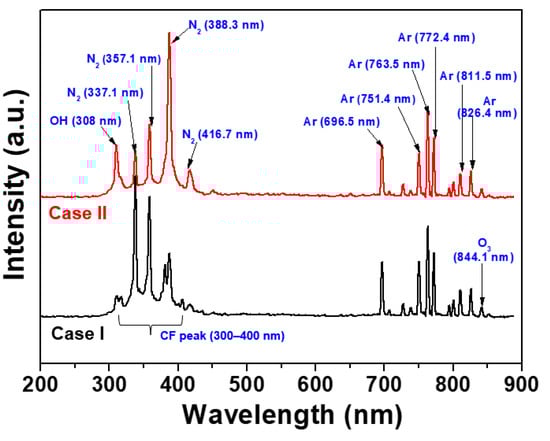 Figure 3 shows the optical emission spectra from 200 to 900 nm, measured in the plasma obtained by AP plasma deposition from the vaporized polymer precursor using a mixed polymer solution comprising P[VDF–TrFE] polymer nano powder and DMF liquid solvent for two different lengths of glass guide tubes (cases I and II). For all OES results, the various nitrogen (N2; 337.1, 357.1, 388.3, and 416.7 nm) peaks, oxygen (OH; 308 nm, and O3; 844.1 nm) peaks, Ar peaks (Ar; 696.5, 751.4, 763.5, 772.4, 811.5, and 826.4 nm), and broad CF peak (300–400 nm) were observed in the produced plasma [,,,]. Even if the same amount of the vaporized polymer precursor was injected in the plasma chamber, for case II, the Ar peaks were not changed, and the nitrogen peaks of 388.3, and 416.7 nm predominantly increased due to the collision reaction between Ar gas and vaporized polymer precursor, when compared to case I, as shown in Figure 3. It also indicates that the increase of the radical species contributes to the fragmentation and recombination in the longer guide tube (case II) for P[VDF–TrFE] thin film deposition.