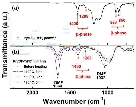 The main functional groups and crystalline phase of P[VDF–TrFE] thin films were characterized using Fourier transformation infrared spectroscopy (FT-IR; Vertex 70, Bruker, Germany) at the KBSI (Daegu, Republic of Korea). The FT-IR spectra were acquired using attenuated total reflection conditions at a wavenumber resolution interval of 0.6 cm−1 in the region from 650 to 4000 cm–1.