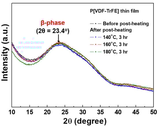 Figure 5 shows X-ray diffraction patterns for P[VDF–TrFE] thin films deposited via AP plasma deposition from the vaporized polymer precursor using a mixed polymer solution comprising P[VDF–TrFE] polymer nano powder and DMF liquid solvent before and after post-heating for 3 h at three different post-heating temperatures (140 °C, 160 °C, and 180 °C). In Figure 4, all P[VDF–TrFE] thin films show a wide diffraction peak at 2θ = 23.4°, which is a specific diffraction peak of the β-phase for the (110) and (200) planes []. Furthermore, all P[VDF–TrFE] thin films had an amorphous structure due to the long-chain molecules with a higher molecular weight []. Thus, the crystallinity in P[VDF–TrFE] thin films weakened, lowering the diffraction peak []. After post-heating with increasing heating temperatures, no changes in the diffraction peaks were observed for all P[VDF–TrFE] thin films. Thus, it can be inferred that the post-heating treatment has no considerable effect on the crystal structure of P[VDF–TrFE] thin films.