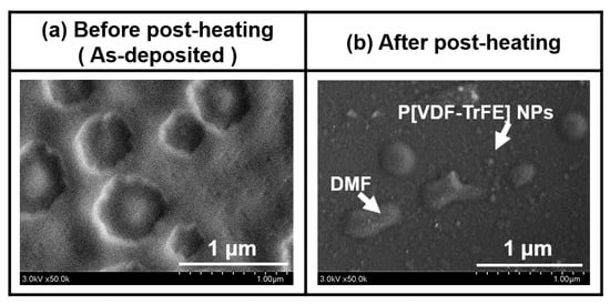 As shown in Figure 6a, the deposited P[VDF–TrFE] thin film was likely to be formed as a coating layer by the DMF solvent. Before post-heating, the sample was predominantly coated with the DMF layer, and then P[VDF–TrFE] nanoparticles (NPs) were not observed.