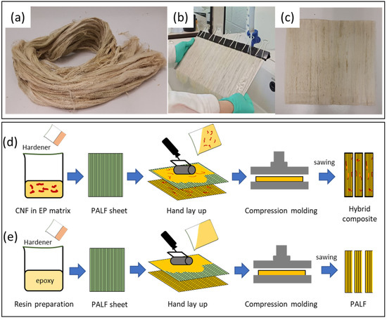 Images of (a) pristine PALF, (b) PALF alignment under running water, (c) dried PALF sheet, and (d,e) illustrations of composite preparations.
