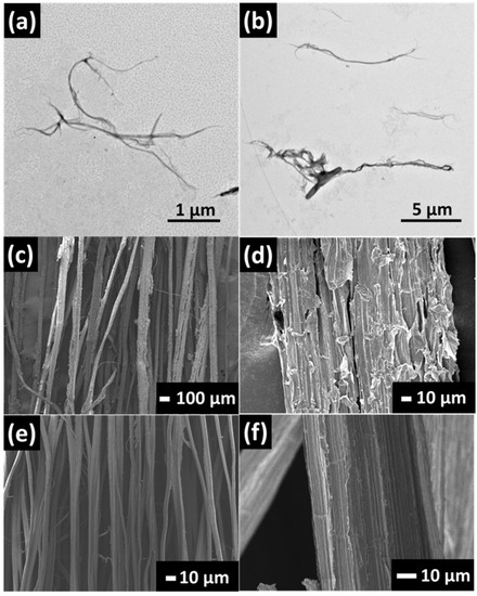 - Xu, X.; Liu, F.; Jiang, L.; Zhu, J.Y.; Haagenson, D.; Wiesenborn, D.P. Cellulose nanocrystals vs. cellulose nanofibrils: A comparative study on their microstructures and effects as polymer reinforcing agents. ACS Appl. Mater. Interfaces 2013, 5, 2999–3009. [Google Scholar] [CrossRef] [PubMed]