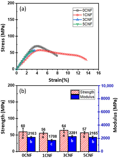 (a) Stress–strain curves and (b) average strengths and moduli at 1% strain of neat epoxy and CNF-filled epoxy composites. Different letters on each bar indicate statistically significant differences in the means.