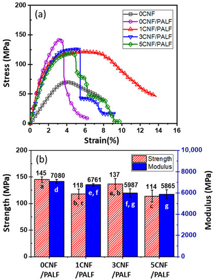 (a) Stress–strain curves and (b) average strengths and moduli at 1% strain of 20PALF in different matrices. Different letters on each bar indicate statistically significant differences in the means.
