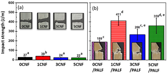 Impact strengths of (a) CNF-reinforced epoxy composite and (b) CNF/PALF in different matrices. Different letters on each bar indicate statistically significant differences in the means.