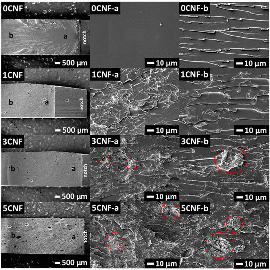 SEM images of impacted specimens of CNF-filled epoxy composites at low magnification (left) and high magnification of corresponding regions (a, b) in the images (panels on the left column). Crack propagated from the right side of the specimen as indicated by notch in low magnification images (left column) to the left side. For areas in red circles see main text.