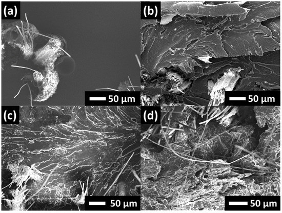 Fractographic images of impacted specimens of 20PALF in different matrices: (a) neat EP, (b) 1CNF, (c) 3CNF, and (d) 5CNF. Scale bars: 50 µm.