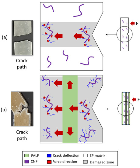 In the case of the CNF-reinforced EP composite material (Figure 8, top panel), when an external load is applied in the direction as indicated, the EP matrix deforms. The deforming matrix shears over the interface between the EP and CNF, causing shear stress to be generated at the interface. This in turn caused the CNF to bend, and bending stress is generated. For a sufficiently high external load, the interfacial shear stress peaks at the ends of the CNF and this leads to matrix yielding and finally cracking; i.e., cracks are initiated in the matrix adjacent to the CNF ends [42]. The cracks propagate into the matrix. In the absence of PALF, i.e., the stronger phase (compared to the EP matrix), there is nothing standing in the way of the path of the crack propagation. In other words, the crack propagation could not be halted [42]. The crack propagates cleanly throughout the specimen cross section until the specimen fractures into two.