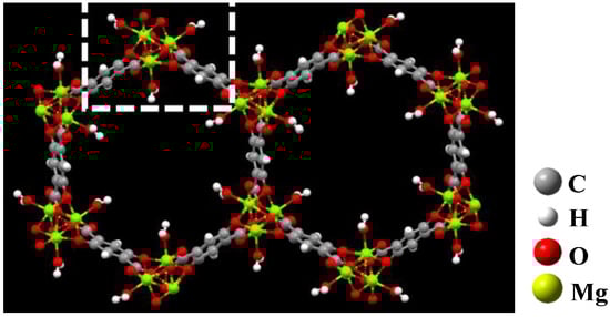 Mg-MOF-74 (CPO-27-Mg) is a new type of nanoscale MOFs material with Mg2+ as the central ion and 2,5-dihydroxy-1,4-benzenedicarboxylic acid as the ligand. Henkelis, S.E. et al. introduced the synthesis method of this MOF in detail []. The crystal structure used in this article is generated by single crystal X-ray analysis, and is currently recorded in the Cambridge structure database (doi: 10.5517/ccdc.csd.cc20k4pf). By analyzing the crystal information file (.cif) in CCDC 1863524, the metal ions/ligands ratio in a single unit cell of Mg-MOF-74 is 9:7. Another useful method for calculating the metal ions/ligands ratio which was mentioned by Visa, A. et al. in the article []: the relationship of the ratio between the number of metal ions and ligands can be deducted by gradually building a 3D supramolecular network throughout the HyperChem 7.52 package.