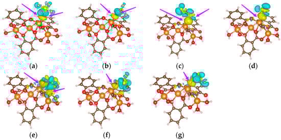 Figure 5a–g shows the charge density difference in the adsorption process. The yellow regions show the electron losing property and the blue regions show the electron gaining property.