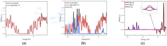 It can be seen from Figure 9a that after adsorbing CS2 gas, a new orbital occupation appears near the position of −2.03 eV, and the other energy positions do not change significantly. Compared with the total orbital occupancy, it can be seen that the orbital occupancy changes near the energy of −2.03 eV, 0.84 eV and 3.69 eV after adsorption of CS2 are contributed by CS2, as shown in Figure 9b. By analyzing the 3s and 3p orbitals of the Mg atom of the adsorption substrate and the 3p orbital occupation of the S atom of the CS2 gas molecule, it can be clearly found that the 3p orbital of the S atom and the 3p orbital occupation broadening curve of the Mg atom overlap near the energy −2.03 eV position (as shown in Figure 9c), which indicates that the Mg-MOF-74 material has bonding adsorption effect on the CS2 gas.