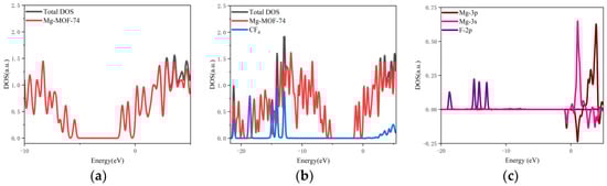 By analyzing the 3s and 3p orbitals of the Mg atom of the adsorption substrate and the 2p orbital occupation of the F atom of the CF4 gas molecule, it can be clearly found that the 2p orbital of the F atom does not overlap with the 3s and 3p orbital occupation broadening curves of the Mg atom (as shown in Figure 8c), which indicates that the Mg-MOF-74 material barely has bonding adsorption effect on the CF4 gas.