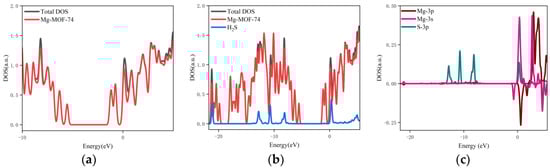 By analyzing the 3s and 3p orbitals of the Mg atom of the adsorption substrate and the 3p orbital occupation of the S atom of the H2S gas molecule, it can be clearly found that the 3p orbital of the S atom and the 3s orbital occupation broadening curve of the Mg atom overlap near the energy of 0.35 eV (as shown in Figure 10c), which indicates that the Mg-MOF-74 material has bonding adsorption effect on the H2S gas.