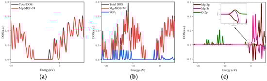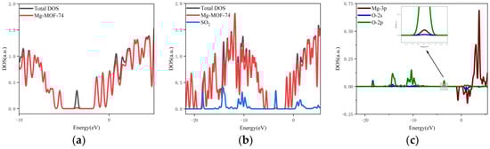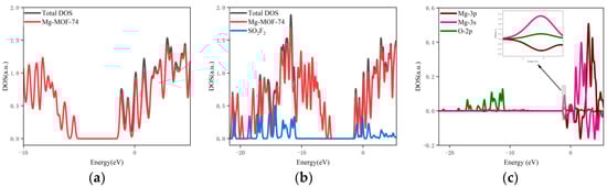 It can be seen from Figure 11a that after the adsorption of SO2 gas, a new orbital occupation occurs near −3.56 eV, and the remaining energy positions do not change significantly. Compared with the total orbital occupation, it can be seen that the change of orbital occupation near the energy of −3.56 eV, −10.35 eV and 1.38 eV after SO2 adsorption is contributed by SO2, as shown in Figure 11b. By analyzing the 3s and 3p orbitals of the Mg atom of the adsorption substrate and the 2p orbital occupation of the O atom of the SO2 gas molecule, it can be clearly found that the 2p orbital of the O atom and the 3p orbital occupation broadening curve of the Mg atom overlap near the energy −3.56 eV position (as shown in Figure 11c), which indicates that the Mg-MOF-74 material has bonding adsorption effect on the SO2 gas.