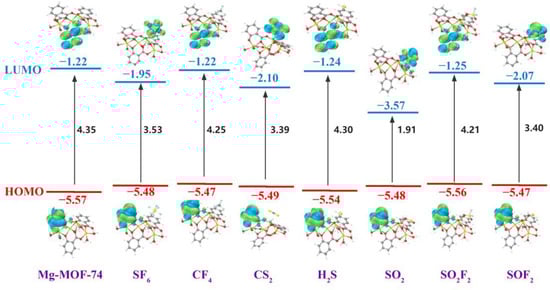 The frontier molecular orbital distribution and energy of Mg-MOF-74 before and after adsorption of seven gases are shown in Figure 14. From the diagram, it can be seen that the highest occupied molecular orbital (HOMO) of the Mg-MOF-74 cluster and the system after adsorbing SF6, CF4, CS2, H2S, SO2, SO2F2 and SOF2 are mainly distributed on the surface of the benzene ring, which is also the same as the law in the literature []. The lowest unoccupied molecular orbital (LUMO) of SF6, CS2, SO2 and SO2F2 systems are mainly distributed on the surface of gas molecules. The LUMO of CF4, H2S and SO2F2 systems are mainly distributed on the surface of the other benzene ring of the cluster. With the change of frontier orbital distribution, the HOMO and LUMO energies of the seven systems have different degrees of increase and decrease, respectively. For HOMO, the change of SO2F2 system is the most obvious, and for LUMO, the change of SO2 system is the most obvious.