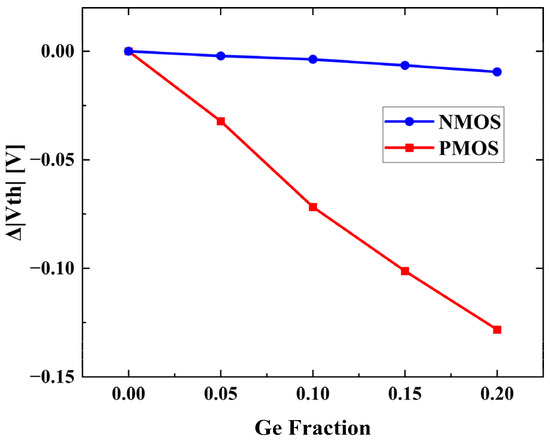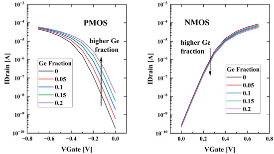 Furthermore, the dependence of threshold voltage (Vth) on Ge fraction of the simulated devices varies according to the doping type, as is displayed in Figure 5. The threshold voltages are extracted by finding the maximum curvature point on the curve. The relationship between the Vth and Ge fraction is approximately linear, and the slope of NMOS and PMOS appears to be different. The slope of NMOS devices hardly varies with Ge fraction, and is roughly −0.48 mV/Ge%. The slope of the absolute value of the threshold voltage variation with Ge fraction for PMOS devices is roughly −6.41 mV/Ge%. The CV characteristics of the devices are simulated at VDrain = ±0.05 V, and VGate from −1.5 V to 1.5 V.