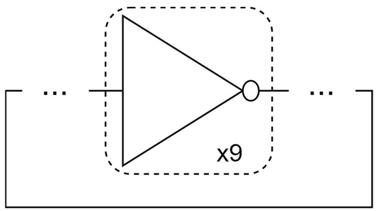 The 9-stage ring oscillator is constructed by connecting the gates and drains of 9 CMOS inverters to each other. The equivalent circuit of the simulated 9-stage RO is shown in Figure 8. To construct a ring oscillator circuit, the number of CMOS inverters needs to be an odd number. Selecting the 9-stage ring oscillator circuit is sufficient to evaluate the performance of the circuits, and is simple enough to accelerate the simulation process and shorten the simulation duration.