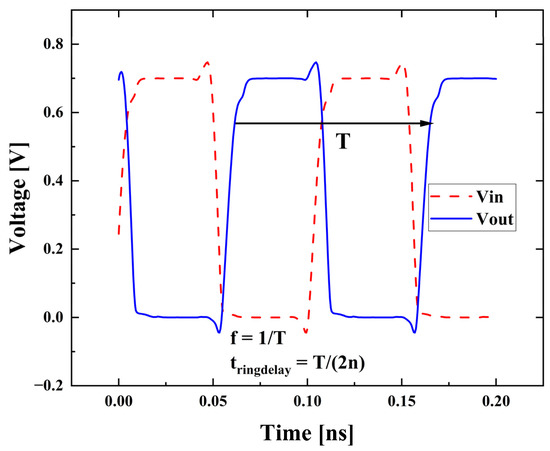 Figure 9 shows the transient simulation result of the RO circuit consists of Si channel devices with an initial perturbation applied. By extracting the neighboring highest and lowest points on the curve and multiplying by two, the period (T) of the RO circuit is calculated. The oscillation frequency (f) of the ring oscillation circuit is the reciprocal of the period, the transmission delay (tringdelay) is the period divided by 2n (tringdelay = T/(2n)), and n is the number of stages of the RO circuit.