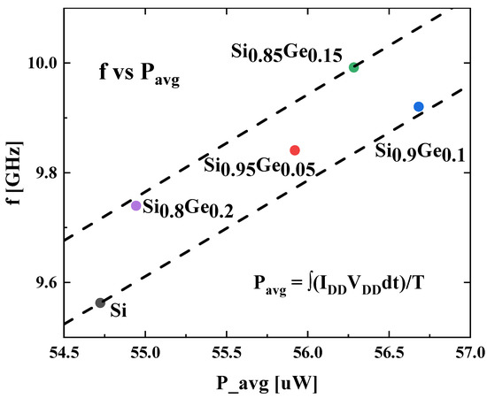 The relationship between the RO oscillation frequency and the RO frequency is analyzed and compared, and the results are presented in Figure 10. The line passing through the point “Si” also passes through the coordinate origin, and so does the line pass through the point “Si0.85Ge0.15”. The other points lie in the region between the 2 lines. In general, the power consumption is positively correlated with the frequency, the circuit with higher Oscillation frequency has higher power consumption. Among the simulated devices, the Si0.85Ge0.15 device offers fastest speed (highest frequency of 9.99 GHz) with the second highest power consumption (56.28 μW), and the Si0.95Ge0.05 device provides medium speed with medium power consumption.