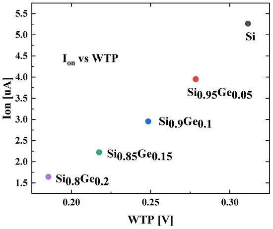 For write state simulation, the write trip point (WTP) and the on-state current are simulated. The WTP marks the voltage when the bit stored in SRAM flips, and the on-state current refers to the current of BL of SRAM when WL = 1. The relationship between the WTP and the on-state current is illustrated in Figure 14. The WTP and the on-state current are both negatively correlated with the Ge fraction in the SiGe channel. The Si devices offer the highest WTP of 0.31 V and the largest Ion of 5.26 μA. The Si0.8Ge0.2 devices provide the lowest WTP of 0.19 V and the smallest Ion of 1.64 μA.