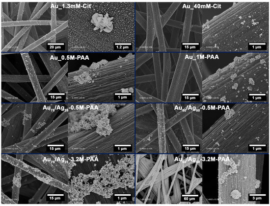 SEM micrographs of Au and Au-Ag particles deposited on CP during gamma radiation of aqueous solutions containing different KAuCl4, Ag2SO4, Cit, and PAA concentrations separated by blue lines. Au_1.3mM_Cit; Au_40mM_Cit; Au_0.5M_PAA; Au_1M_PAA; Au75/Ag25_0.5M_PAA; Au50/Ag50_0.5M_PAA; Au75/Ag25_3.2M_PAA; Au50/Ag50_3.2M_PAA.