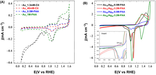 To determine the electrochemical characteristics of the as-fabricated materials, we next utilized the CV in 0.1 M NaOH solution (further referred to as blank CV). For the monometallic samples, the blank CV profiles shown in Figure 2A display a capacitive current range between 0.1 and 0.6 V vs. RHE and a broad anodic peak around 1 V vs. RHE, which is attributed to the specific adsorption of OH− species (i.e., formation of surface Au(OH)* species) [61,62]. The following increase in the anodic current around 1.3 V vs. RHE samples occurs due to oxidation of Au(OH)* to AuOx oxide [61,63]. The potential sweep was reversed at 1.6 V vs. RHE prior to further oxidation of the water. An asymmetric cathodic peak was observed at 1.07 V vs. RHE, assigned to the reduction of gold oxide back to metallic gold. For the sample Au_1.3mM-Cit firstly synthesized (black dash line), the increase in negative current at low potential is assigned to the reduction of O2 at the surface, which originates from a poor removal of the dissolved gas by bubbling N2 gas in the electrolyte that was further improved for the following samples. For the sample Au_40mM-Cit (red dash line), a greater Cit induces a current density that is about four times lower, and it is consistent with the reduced deposition density observed in the SEM micrographs. For samples prepared with PAA (blue and green dash lines), the voltammograms show broader oxidation peaks which are probably due to the altered access and diffusion of solutes at the metal surface [64,65]. The current density peaks increase with increasing PAA concentration, consistent with the deposition density observed in the SEM images. The reduction peak shows a shoulder on the more negative potential side, suggesting the possible formation of different Au crystal lattices, as evidenced by the different Au morphologies (small particles and larger agglomerates).