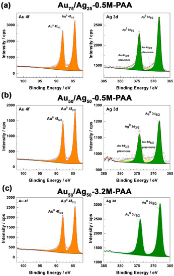 For the Au50/Ag50-0.5M-PAA sample, with equal molar fractions of [AuCl4−] and [Ag+] in the initial reaction mixture, the high-resolution XPS spectra (see Figure 3b) displays narrow-scan spectra of Au 4f and Ag 3d at the same positions, confirming the metallic state of both metals.