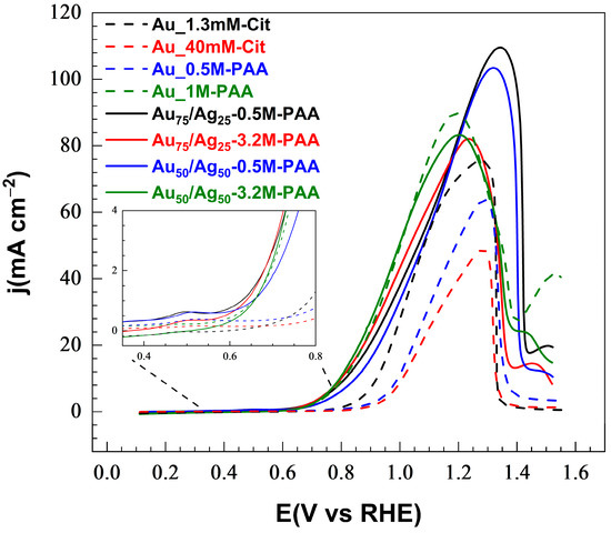 Voltammograms recorded in aqueous solution containing 1 M of NaOH and 0.1 M of glycerol for the monometallic samples Au_1.3mM-Cit and 1mM-Au_1M-PAA and bimetallic samples Au75/Ag25-0.5M-PAA, Au75/Ag25-3.2M-PAA, Au50/Ag50-0.5M-PAA, and Au50/Ag50-3.2M-PAA at 25 °C at 50 mV·s−1. Insert: extending to the range of potentials 0.3–0.8 V vs. RHE to show the onset potentials.