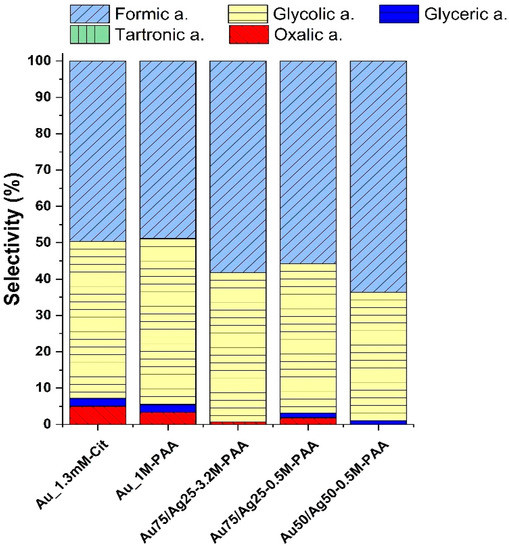 The small drop in current densities for all samples at the 15th minute is due to the removal of an aliquot of the reaction mixture. Aliquots were analyzed by high-performance liquid chromatography (HPLC) after 15 and 30 min of chronoamperometry measurement by comparing with five possible reference compounds (shown in Scheme 1). HPLC detects two major products: formic (48.9–63.7%) and glycolic (35.3–45.6%) acids. The identified products of the oxidation with their concentrations and calculated selectivity are reported for the monometallic and bimetallic catalysts, respectively, in Table S8. We note that the high selectivity demonstrates that the present electrocatalysts can be implemented in an electrolyzer for formic acid production given its high potential as a fuel or chemical (for example the formic acid fuel cell). A bar plot in Figure 7 compares the selectivity of five electrodes (Au_1.3mM-Cit, Au_1M-PAA, Au75/Ag25-0.5M-PAA, Au75/Ag25-3.2M-PAA, and Au50/Ag50-0.5M-PAA).