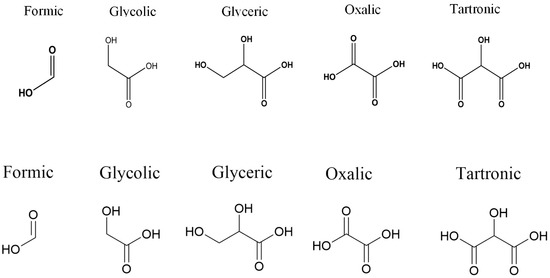 Five potential products of glycerol electro-oxidation as identified by HPLC. We note that the corresponding carboxylates are the reaction products during the bulk electrolysis in 1 M NaOH.