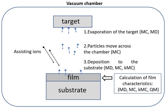 Scheme of the process of physical vapor deposition and methods used to simulate the stages of PVD: Monte Carlo (MC), molecular dynamics (MD), kinetic Monte Carlo (kMC), quantum methods (QM).