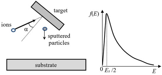 Geometry of the sputtering process, α is the incident angle (left) and schematic representation of the energy distribution of the sputtered particles using the Thomson formula [] (right). The distribution maximum is located about of Es/2, where Es is the surface energy of the target atom (~several eV).