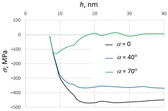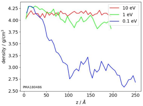 The density profiles, calculated based on the structure of the atomistic clusters, show density distribution across the film thickness [,,,]. To calculate the profiles, the film volume is divided into layers, parallel to the substate plane, and further density is calculated for every layer. For high-energy films, these profiles are smoother than for low-energy films (Figure 5). The large fluctuations in the density profiles indicate the high porosity of the films. Also, the density profiles show the thickness of the transition layers between substrate and film and film and vacuum. This value is about of 2 nm thickness [,].