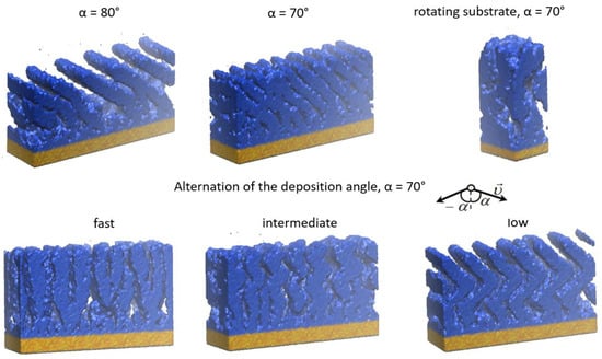 - Hubartt, B.C.; Liu, X.; Amar, J.G. Large-Scale Molecular Dynamics Simulations of Glancing Angle Deposition. J. Appl. Phys. 2013, 114, 83517. [Google Scholar] [CrossRef]