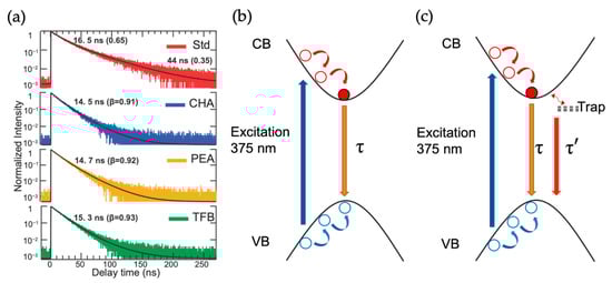 (a) Overlay of TCSPC decay profiles and curve fits of Std, CHA, PEA, and TFB PeNCs. The decay profiles were monitored at their respective PL maxima positions of the samples. (b,c) PL decay mechanism for the surface-passivated and standard PeNC samples, respectively.