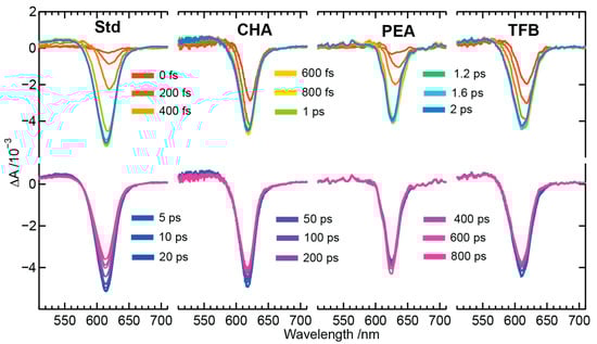 TAS profiles of Std, CHA, PEA, and TFB PeNC samples of the composition CsxFA(1−x)PbBryI(3−y). The actinic excitation wavelength for the samples was set to 480 nm.